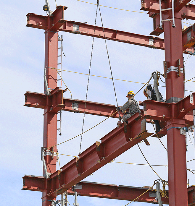 マンション・商業施設など、大型鉄骨建造物等を設計どおりに組み立てるのためには、骨組みとなる鉄骨の寸法は数ミリの狂いも許されません。全体的なバランスだけでなく、耐震・耐久性にも大きく関わるため、高度な技術が要求されます。株式会社め組工業では、細かな鍛冶工事も含め、現場に届いた鉄骨を設計図どおりに加工・調整し、建物の骨となるよう組み立て、仕上げます。